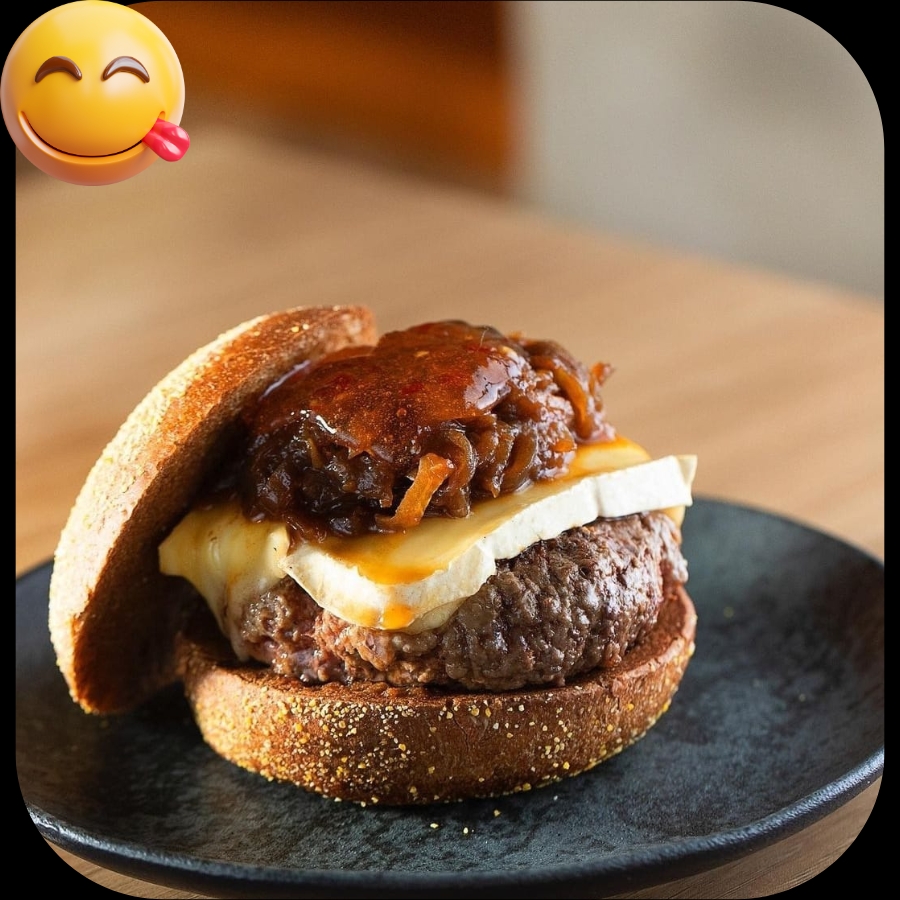 Pão brioche tostado na manteiga, suculento e delicioso blend de 100 g, assado na brasa, queijo coalho, cebola caramelizada e molho barbecue.